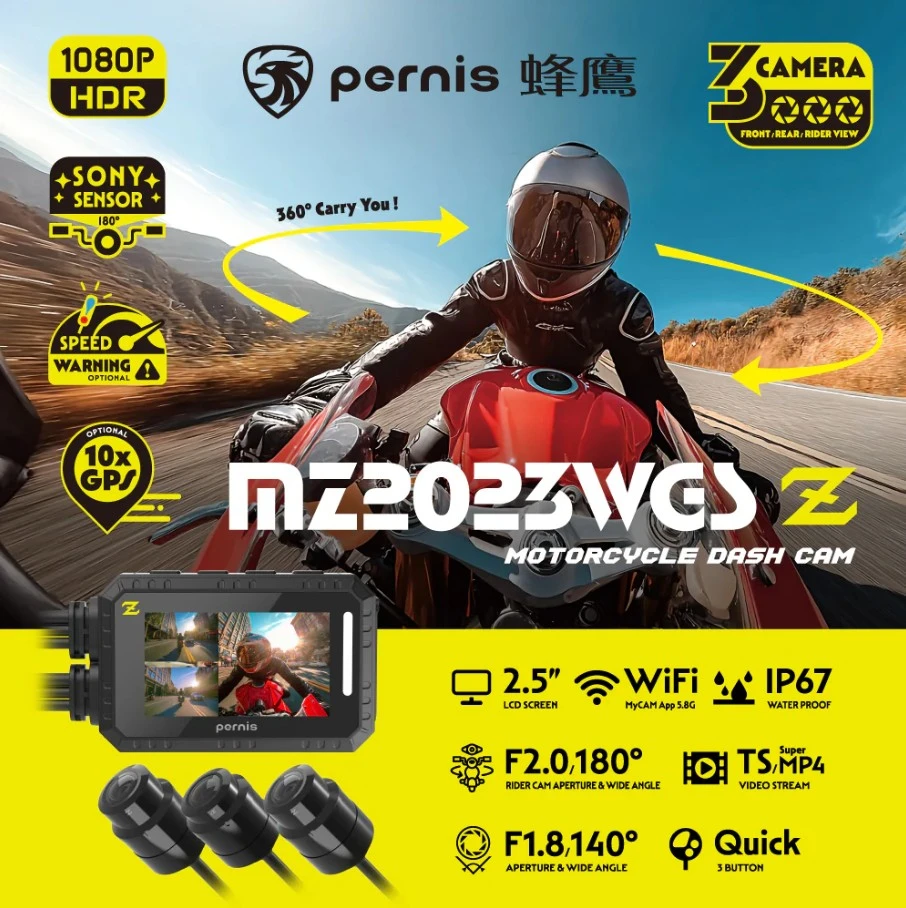 寶麗萊 MZ2023WGS 三錄機車行車記錄器 是目前機車行車記錄器市場中少數採用「三鏡頭設計」的機種,主打前後 1080P HDR 錄影,搭配 180 度環視鏡頭,能完整涵蓋騎乘時的四向視野。