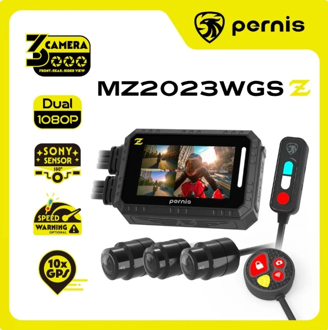 寶麗萊 MZ2023WGS 三錄機車行車記錄器 主打「三鏡頭全向視野」,透過前後雙鏡+180°環視鏡頭,補齊傳統行車記錄器無法涵蓋的左右死角。